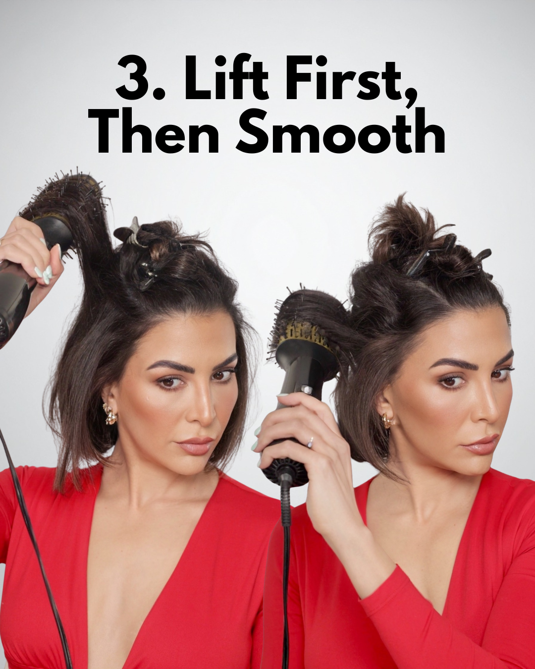 Where you place the brush matters. If you start halfway down and pull straight down, you’ll lose volume and end up flat at the roots.
