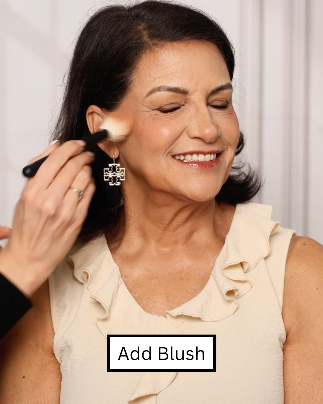 Apply blush on the cheeks and blend upward for a fresh, youthful pop of color.